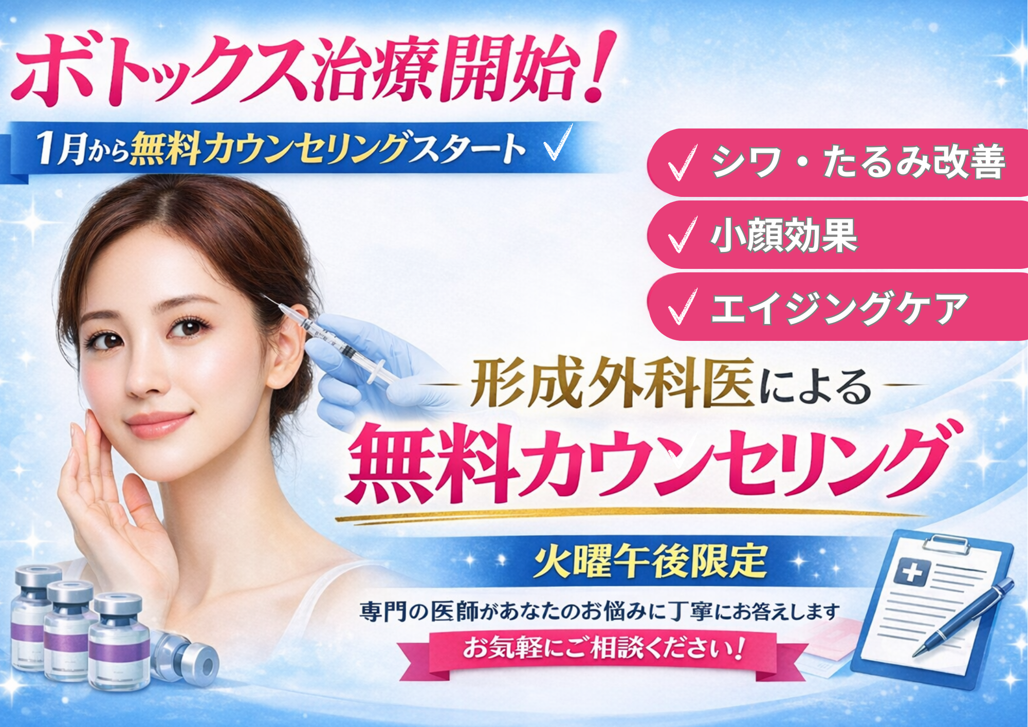 このたび当院では、しわにお悩みの方を対象としたボトックス治療の無料カウンセリングを、2026年1月より開始いたしました。