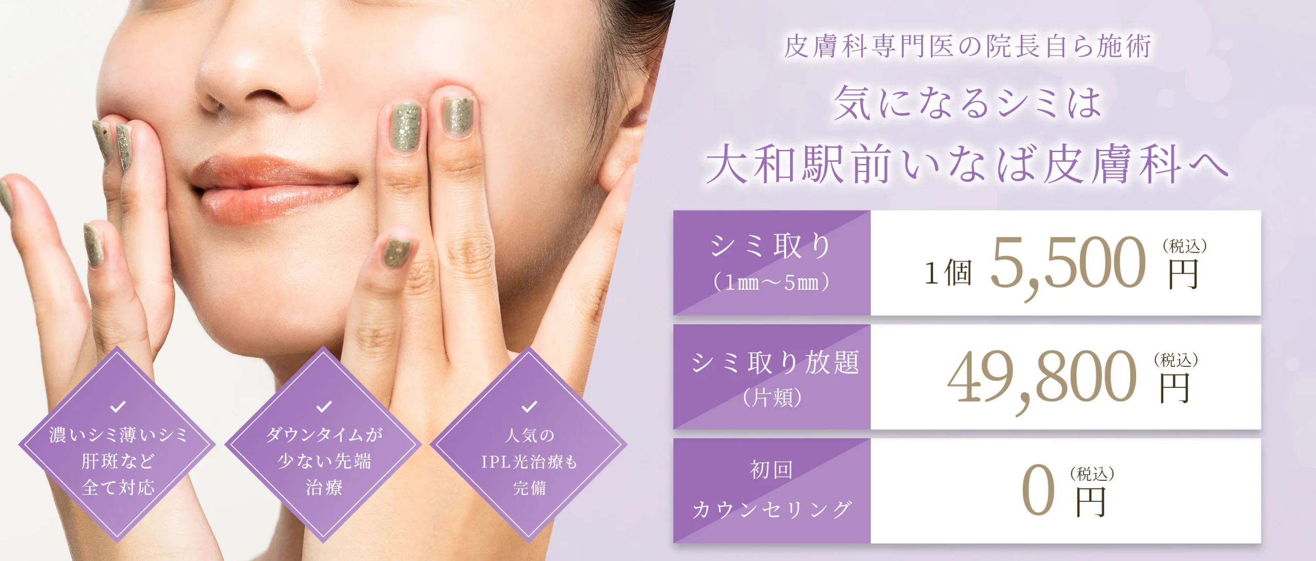 大和市にある皮膚科・美容皮膚科の大和駅前いなば皮膚科院長稲葉基之です。Qスイッチヤグレーザーページへご訪問いただきありがとうございます。Qスイッチヤグレーザーは2つの波長(532nm、1064nm)を使い分けることで、シミ・そばかす・あざなどの幅広い症状に対応しております。当院は大和市、綾瀬市、座間市、海老名市では数少ない最新レーザーを導入しており、健康な肌へのダメージを最小限に抑えながら症状の治療を行うことができます。また、これまで治療が難しいとされていた肝斑も「レーザートーニング」という治療法で肝斑を悪化させることなく、改善することができます。患者様に合った治療を行うためにもまずは、皮膚科学科専門医の院長自ら診察、施術を行います。大和市、綾瀬市、座間市、海老名市でシミ・そばかす・肝斑にお悩みの方はお気軽にご相談ください。